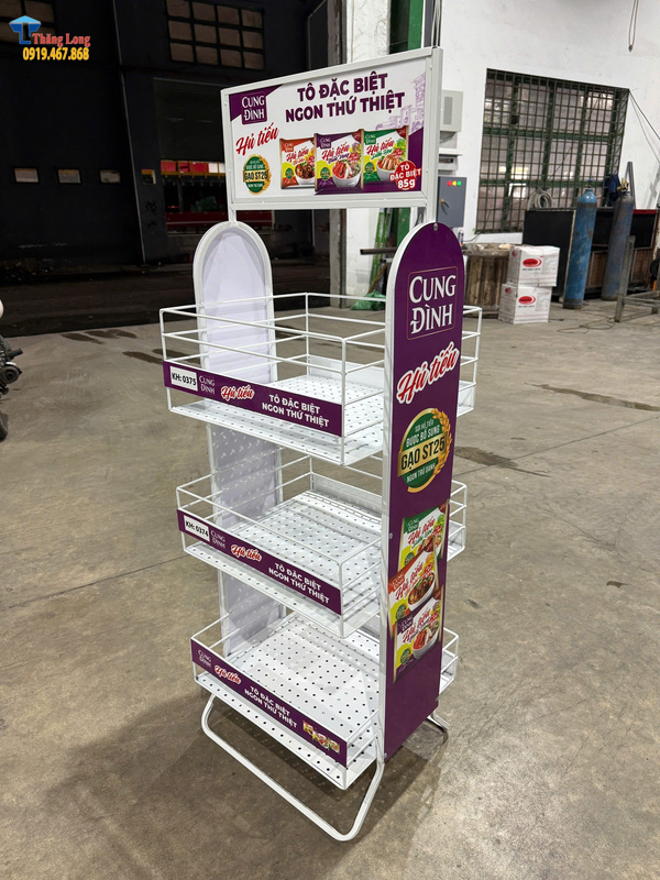 Trong bối cảnh cạnh tranh mạnh mẽ tại điểm bán, kệ trưng bày đóng vai trò quan trọng trong việc thu hút khách hàng và tăng nhận diện thương hiệu. Thăng Long tự hào sản xuất giá kệ trưng bày quảng cáo mì tôm Cung Đình, thiết kế hiện đại, nổi bật, góp phần tôn vinh hình ảnh thương hiệu, tối ưu hiệu quả trưng bày sản phẩm.