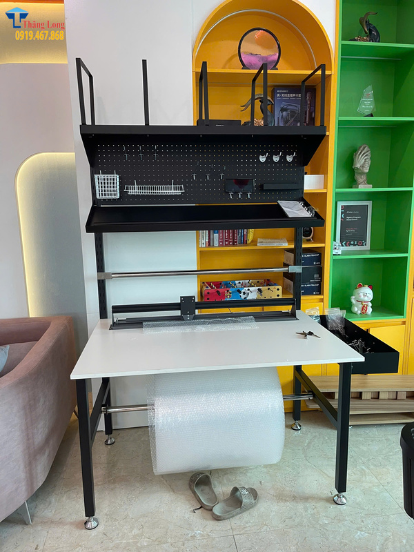 Phía trên được trang bị kệ chứa và bảng tôn đục lỗ giúp sắp xếp dụng cụ gọn gàng, tiện lợi. Phần dưới bàn có thanh đỡ cuộn xốp hơi, hỗ trợ quá trình đóng hàng nhanh chóng và chuyên nghiệp hơn.