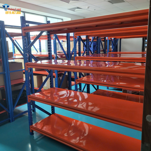 Bên cạnh đó, toàn bộ kệ được sơn tĩnh điện hai màu cam - xanh dương, vừa tăng khả năng chống ăn mòn, vừa mang lại vẻ hiện đại, đồng bộ cho không gian kho. Đội ngũ kỹ thuật của Thăng Long trực tiếp vận chuyển, lắp đặt và kiểm tra nghiệm thu tại chỗ, đảm bảo đúng tiến độ và tiêu chuẩn chất lượng đã cam kết.